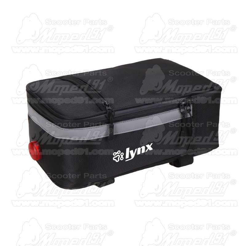 kerékpár táska csomagtartóra, világítással, 28x16x11 cm, anyaga: 600D nylon szövet, súly: 280g,fröccsenésálló,kényelmes kézben tartható, fekete világos szürke csíkkal, LYNX
