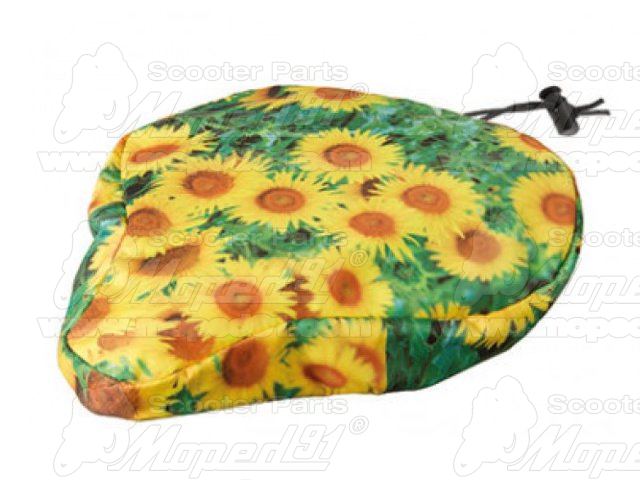 kerékpár nyereghuzat, napraforgó minta, feszítő zsinórral, 10 mm szivacsos párnázattal, univerzális méret: 250 x 230 mm. Német minőség